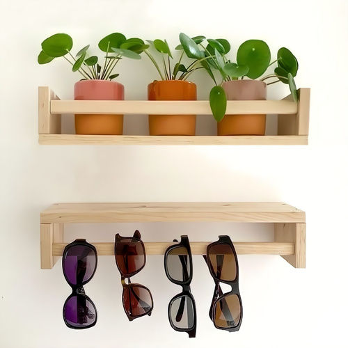 اگه به تصویر این محصول نگاه کنید، میبینید که چطور این شلف چوبی مینیمال توی یه فضای ساده و زیبا قرار گرفته. روی شلف بالایی، گلدونهای کوچیک با گیاهان سبز چیده شدن و شلف پایینی برای آویزون کردن عینکها استفاده شده. علاوه بر این، طراحی مینیمال این شلف باعث میشه که بتونید اون رو توی هر فضایی، از اتاق نشیمن گرفته تا اتاق خواب یا حتی دفتر کار، بهراحتی استفاده کنید. این شلف برای هر کسی که به سادگی و زیبایی اهمیت میده، مناسبه.