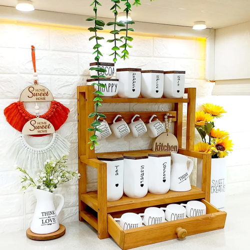 برای چیدمان استند کافیبار کشودار، میتونین از ایدههای خلاقانه استفاده کنین. مثلاً، یه گلدان با گلهای مصنوعی یا طبیعی کنار استند بذارین. در نتیجه، دکوراسیون آشپزخانهتون زیباتر و دلانگیزتر میشه. علاوه بر این، میتونین فنجانهای رنگی رو روی طبقات استند آویزون کنین تا جلوهای شاد به فضا ببخشین. اگر این استند رو برای جهیزیه میخواین، میتونین با تیم غراب چوب برای حکاکی اسم یا طرح خاص هماهنگ کنین. به همین دلیل، این استند میتونه یه هدیه خاص و بهیادموندنی باشه. طراحی مدرن این استند چوبی، به آشپزخانهتون حس طبیعت و آرامش میده. غراب چوب مدلهای جدید و متنوعی از استند آشپزخانه داره که میتونین با دنبال کردن پیج ما ازشون باخبر بشین و ایدههای جدید چیدمان پیدا کنین.